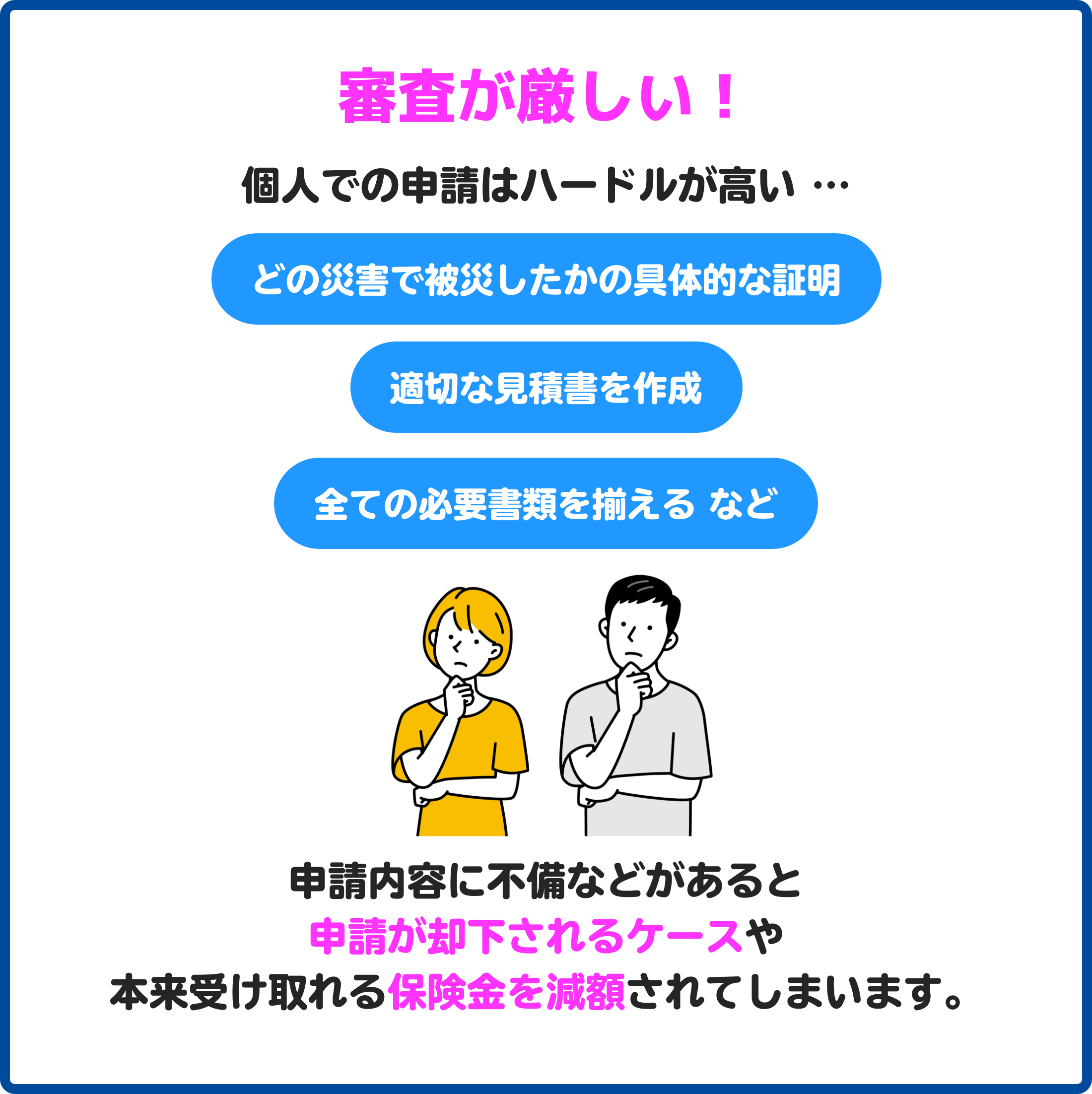 火災保険申請は、自力でも可能ですが、被害の見落とし・書類不備・根拠不足で認定されないリスクがあります。