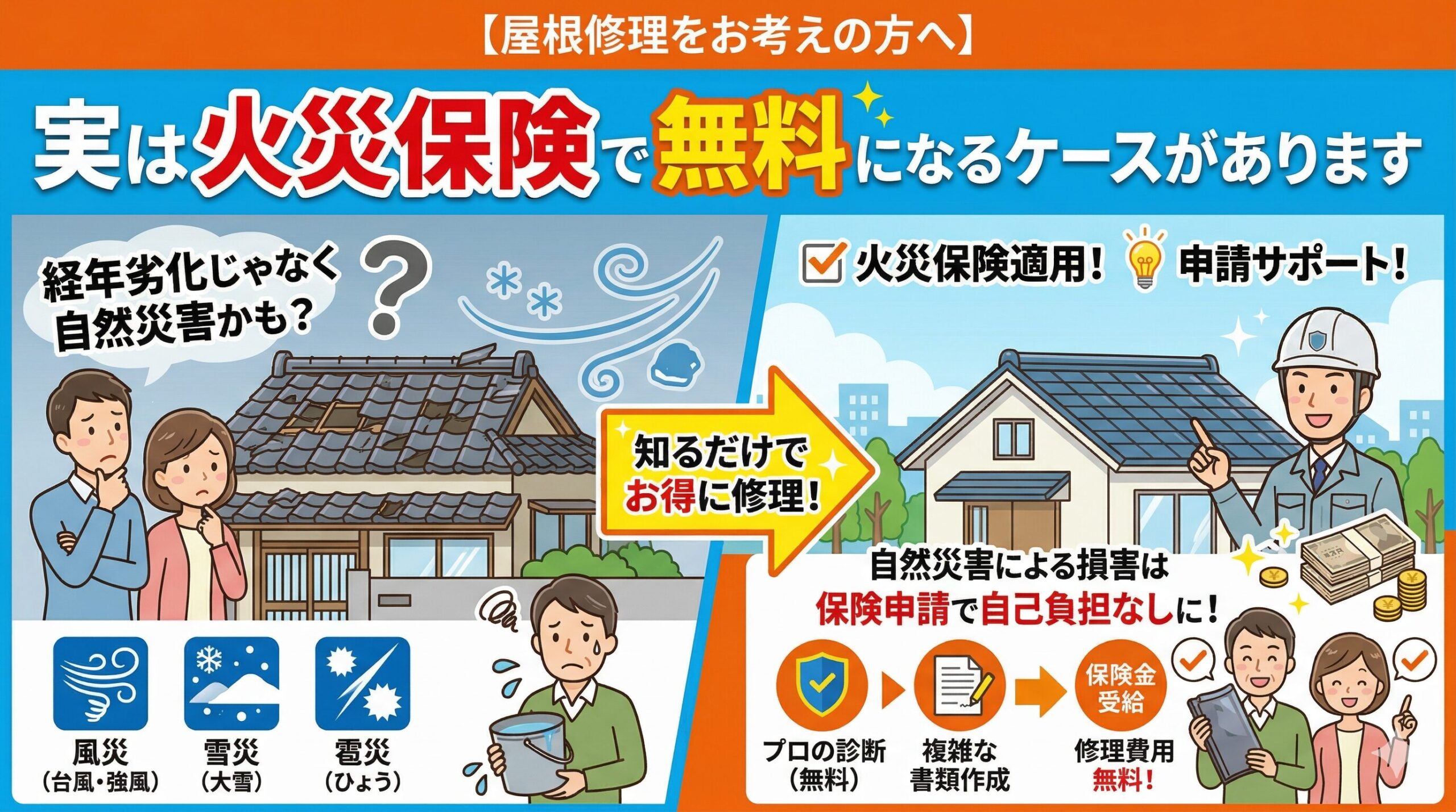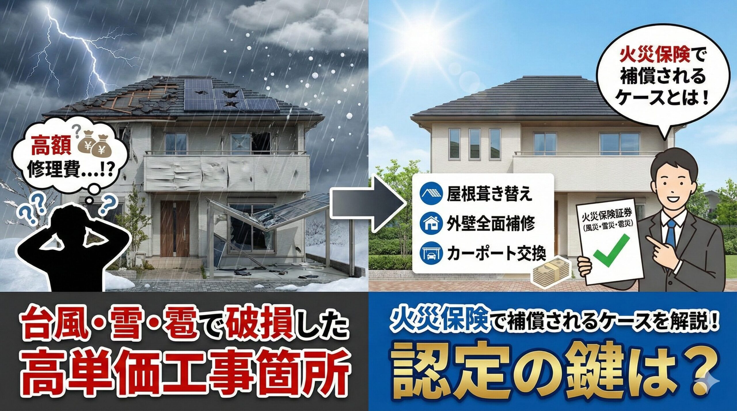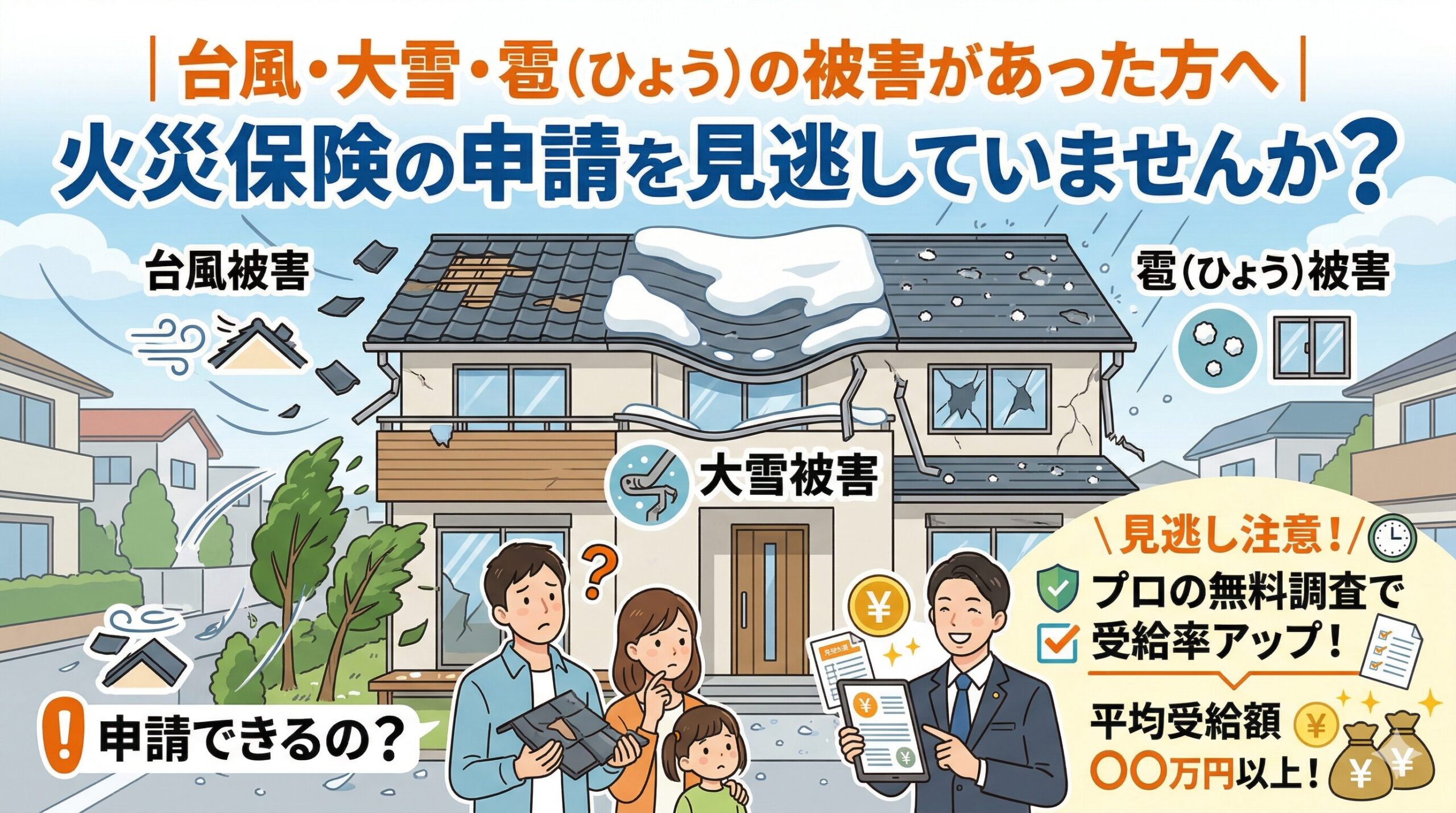 火災保険は火災だけでなく、台風・暴風・落雷・雪災・水災・水漏れ・飛来物・落下物などの自然災害による建物被害にも幅広く対応しています。しかし実際には、「どこまで保険金が下りるのか分からない」「申請書類が難しい」「見積書の書き方が分からず認定されない」という悩みを抱える方が非常に多く、保険金を受け取りきれていないケースが全国で増えています。