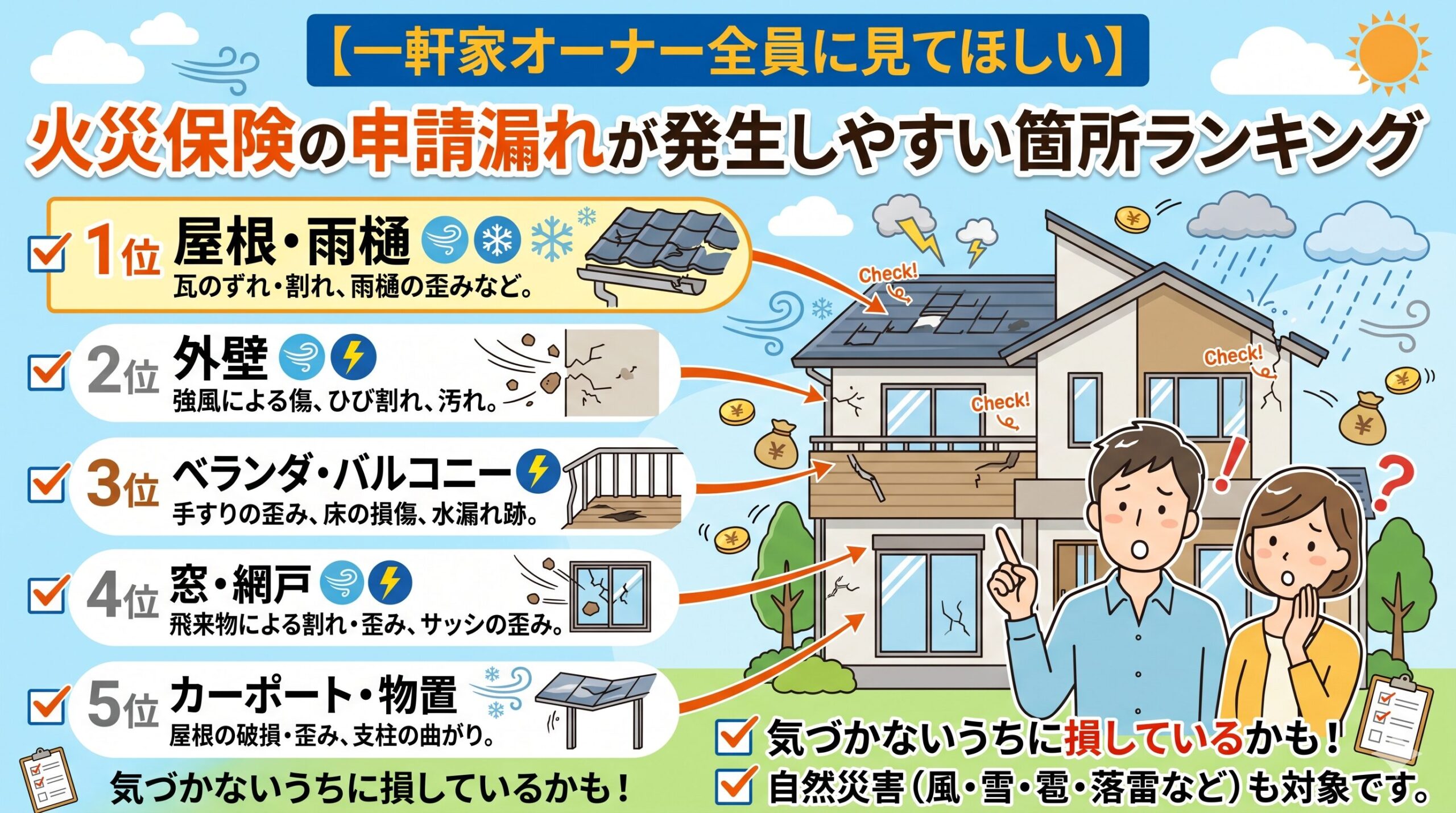 - 屋根や外壁の破損が、築年数による摩耗や老朽化が原因ではないか、**強風による「突発的・偶然的」な力**によって発生したものかを詳細に確認します。特に錆びや腐食が進んだ箇所は厳しくチェックされます。
