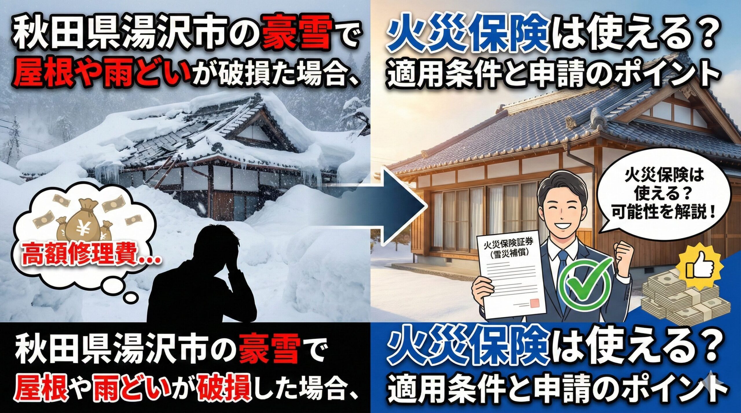 今回は、湯沢町ならではの特殊な事情(豪雪・リゾート物件・遠隔地管理)に特化して、なぜ修理費が高くなるのか、そして火災保険を最大限に活用して負担をゼロに近づける方法を徹底解説します。