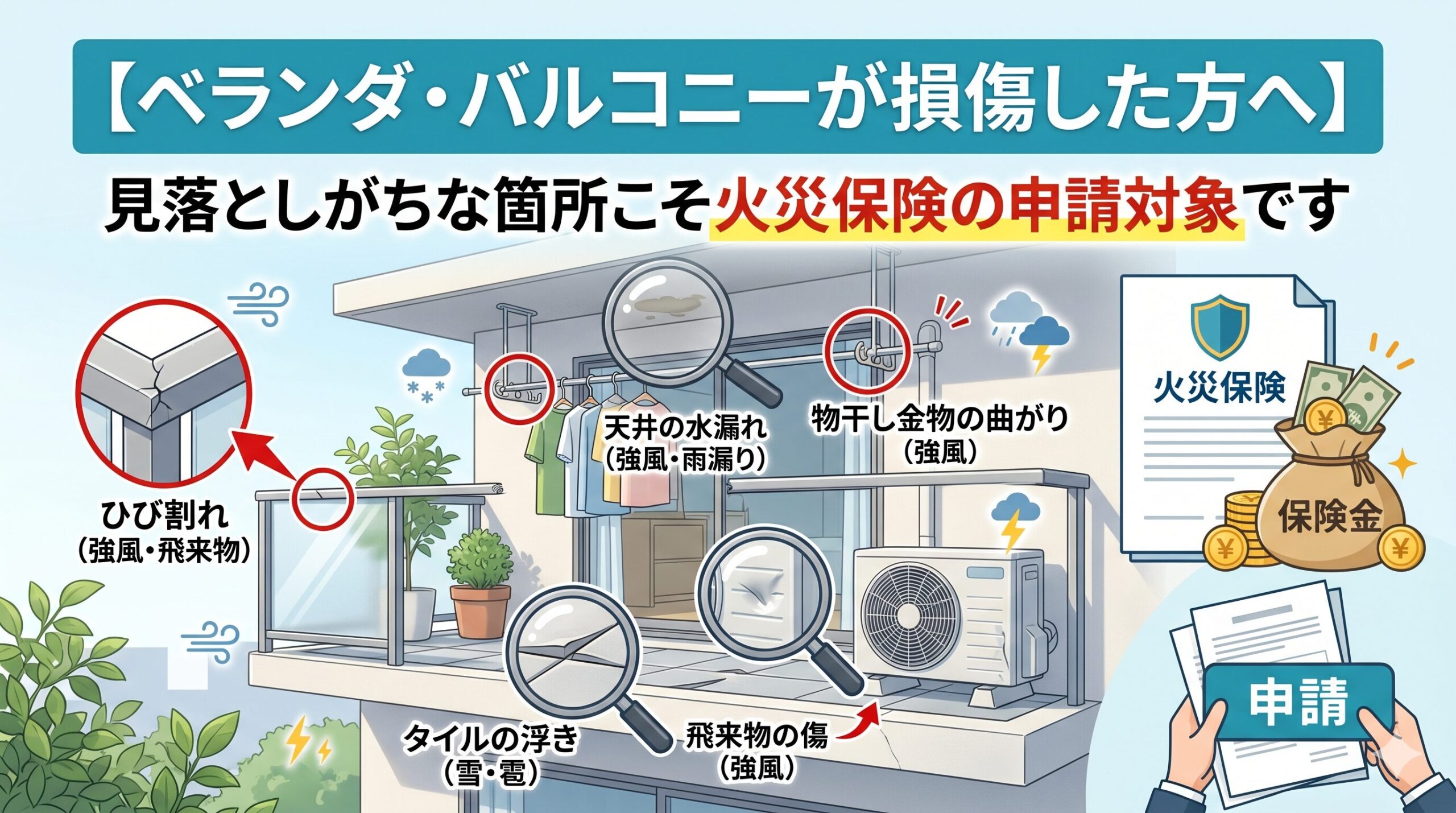 【ベランダ・バルコニーが損傷した方へ】見落としがちな箇所こそ火災保険の申請対象です