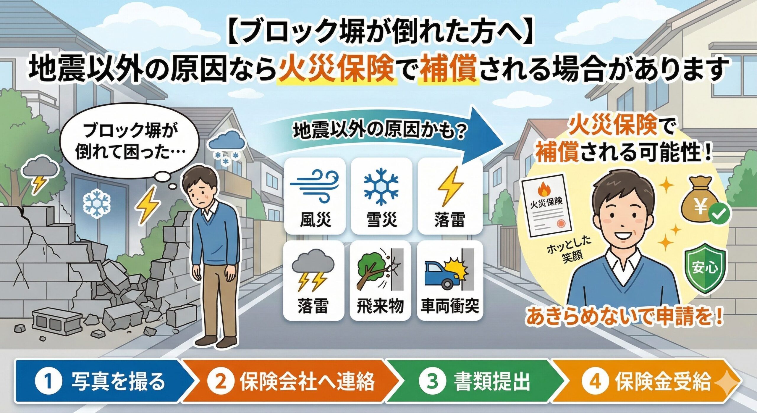 【ブロック塀が倒れた方へ】地震以外の原因なら火災保険で補償される場合があります